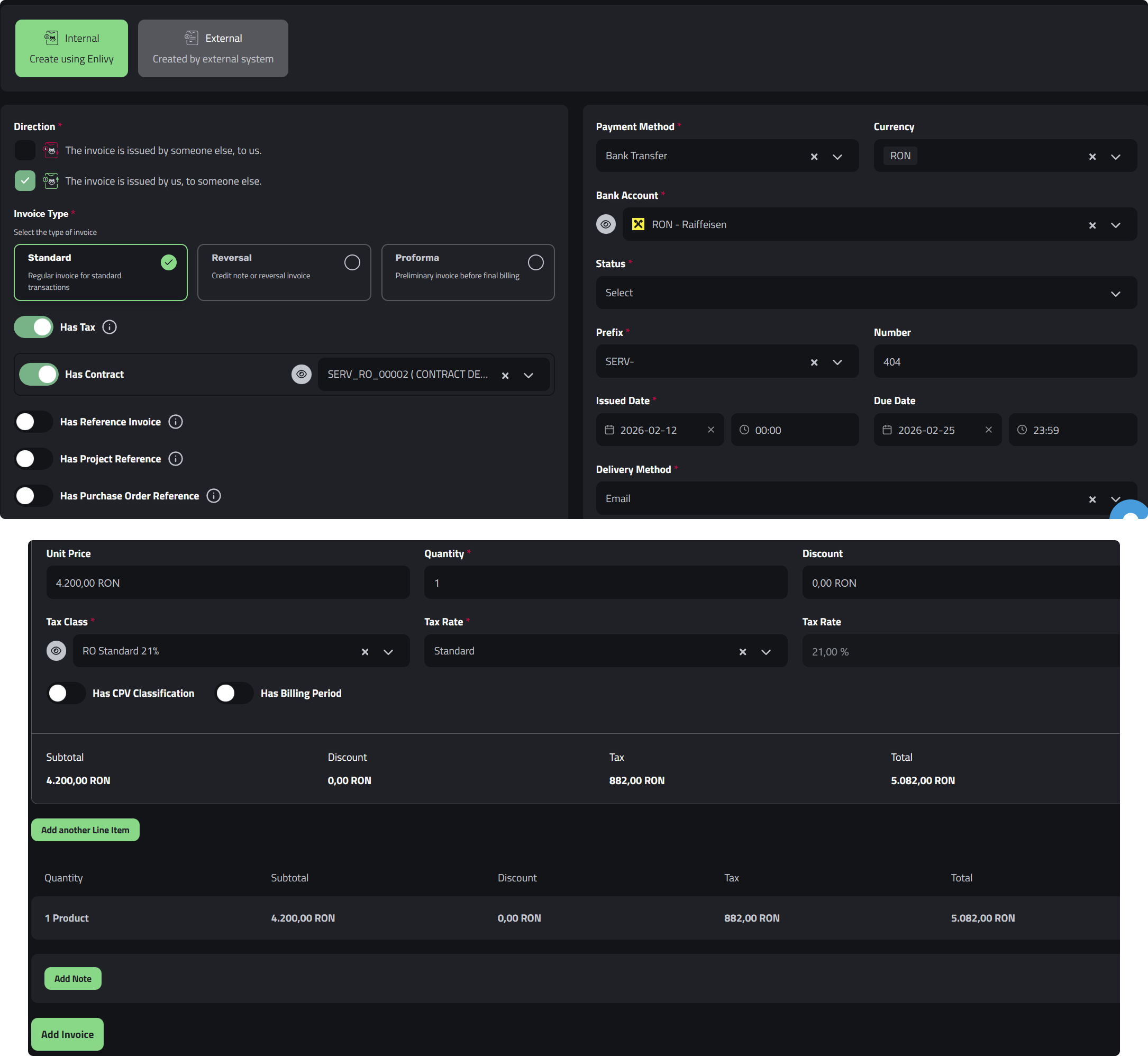 Intri în secțiunea Invoices din Enlivy și apeși Add Invoice. Selectezi Internal pentru a folosi sistemul integrat al platformei. Primul pas este să alegi direcția Outbound (factură emisă către un client) și să specifici dacă factura include TVA.